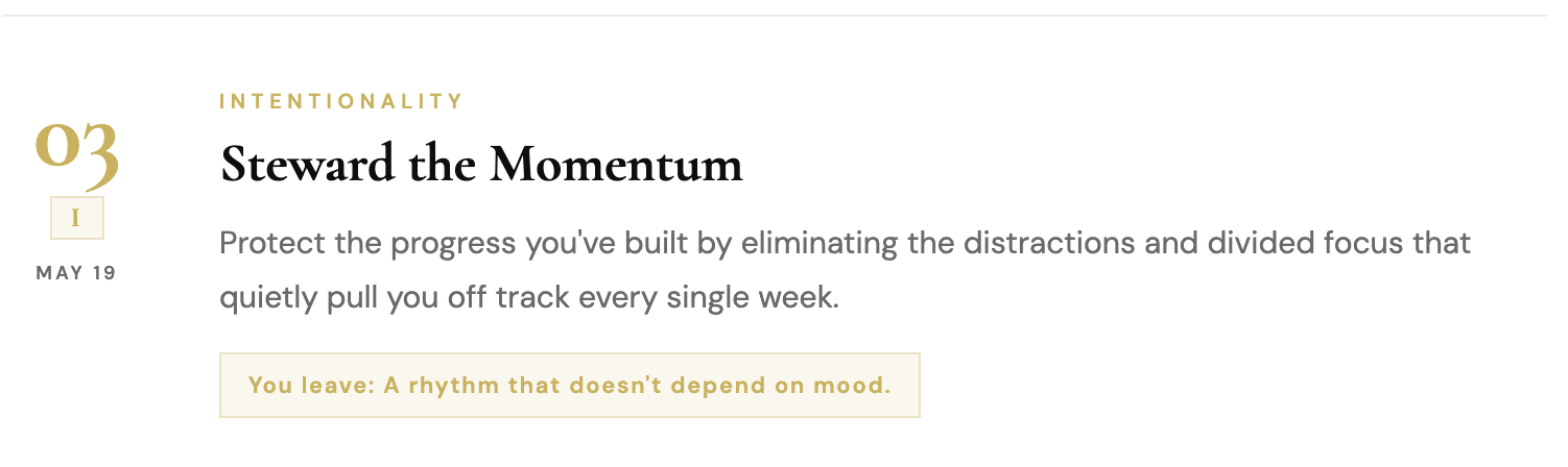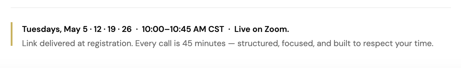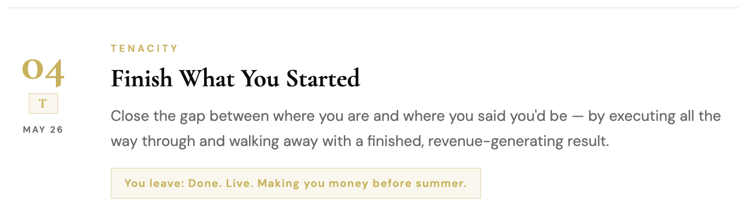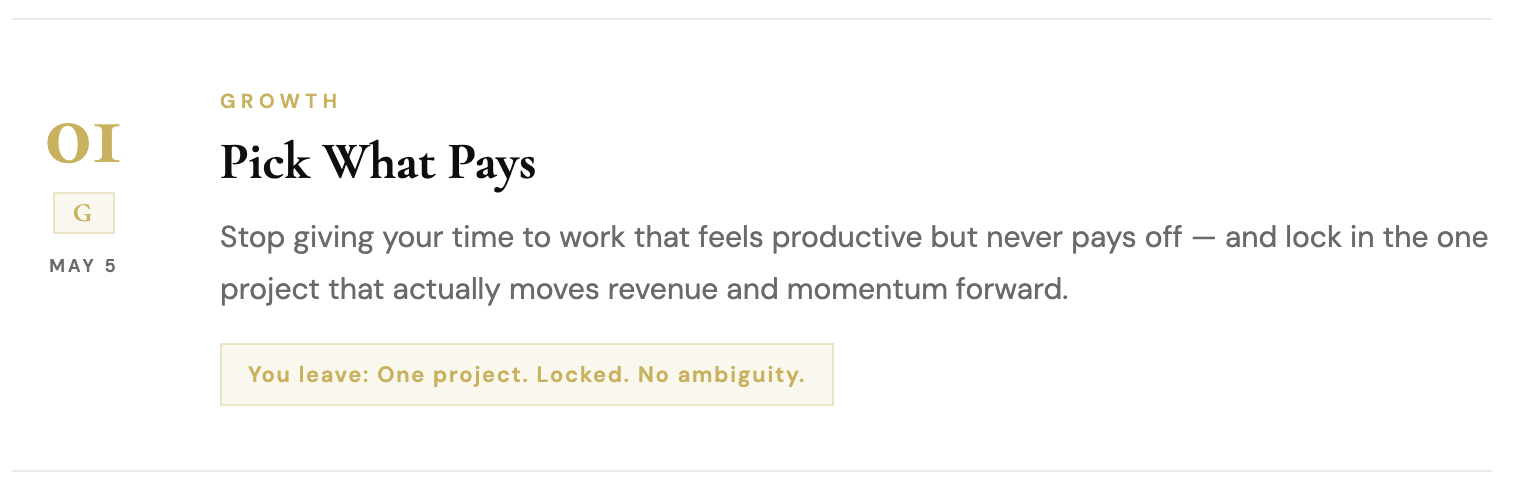 You have been 3–5 years in business. You know what to do. What you need is a room that holds you to done — in 30 days, on a project that makes you money.