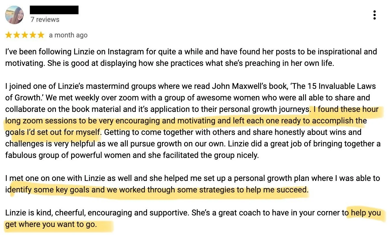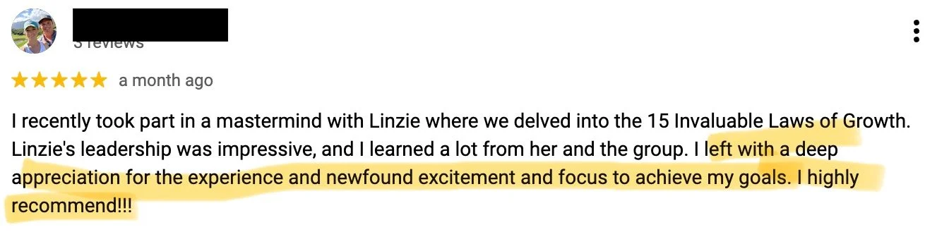 One client said, "Linzie’s mastermind is a great place to start to get on track and develop a game plan! Also a great opportunity to connect with other like-minded individuals to add to your network!"